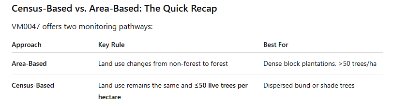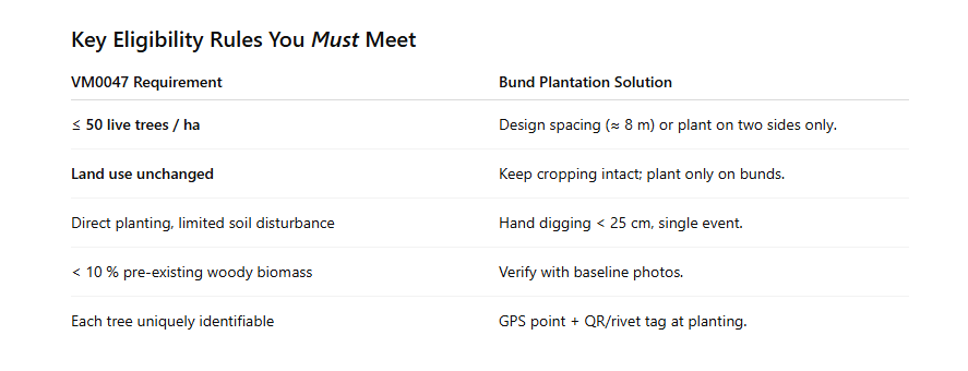 - Bund agroforestry does qualify under VM0047’s census-based pathway- but only when you cap density at ≤ 50 trees per hectare and tag every tree.