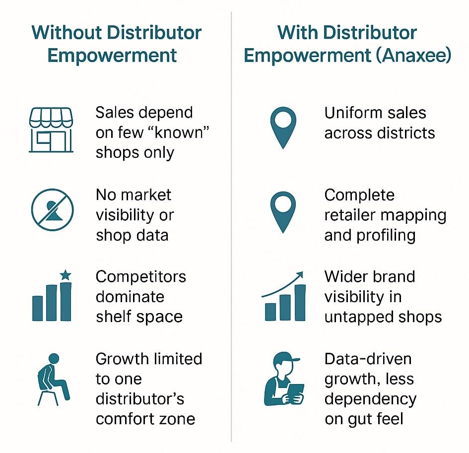 Distributor empowerment is not about replacing them, but about giving them tools and support. With Anaxee’s mobile app and dashboards: –Every shop visit is tracked in real time. -Order data is visible down to SKU level. -Brands get analytics on performance across districts. -Distributors are no longer working blindly — they have visibility and accountability.