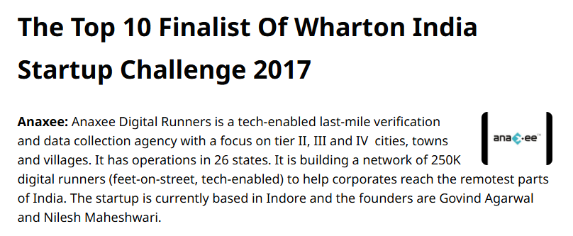 Shortly after its GES recognition, Anaxee was shortlisted as a finalist in the Wharton India Startup Challenge, organized by the Wharton School of the University of Pennsylvania.