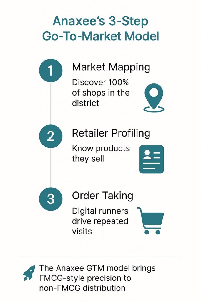 (Example: In East UP, Anaxee mapped 8,000+ shops across 27 districts, identifying untapped clusters that held 25–35% market share potential.)